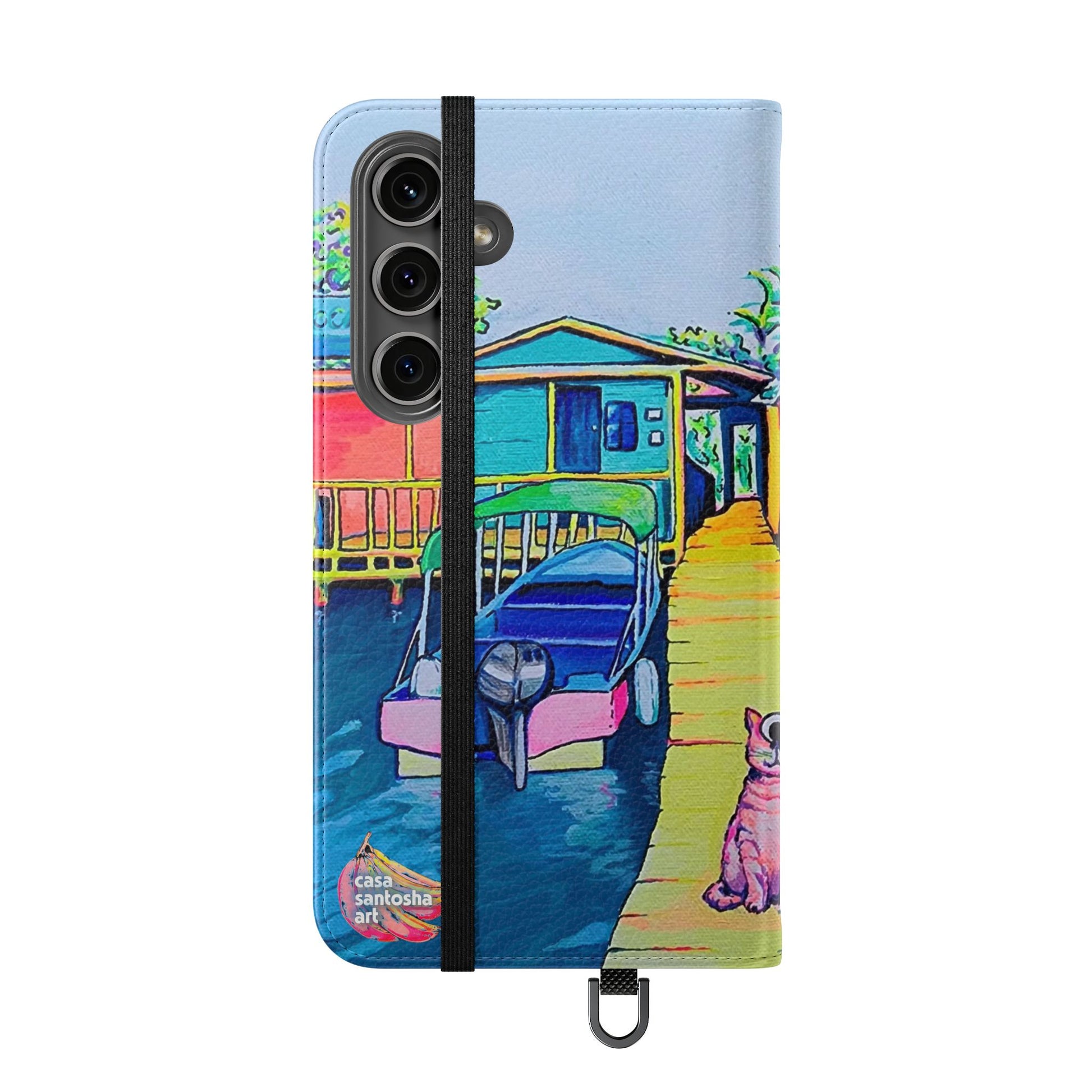 A lively flip phone case that brings color and curiosity to everyday carry. The lively tropical artwork — Cyclops Cat and Dog in Bocas — turns your phone into a tiny window to island living. The folio-style design keeps essentials together: stitched card pockets for quick access, a durable polycarbonate inner shell for reliable protection, and a flat elastic closure to hold everything in place. Built from cruelty-free faux leather, it feels luxe without harming animals and includes a small care slip so the case stays looking fresh. For Samsung S24 and S25 users, a discreet D-ring allows attachment of a wrist or neck strap for hands-free moments on commutes or travels. The fold-out stand supports comfortable media viewing while ports remain open for easy charging and connectivity. Thoughtful, colorful, and practical — this case adds personality while keeping your phone and essentials secure.
