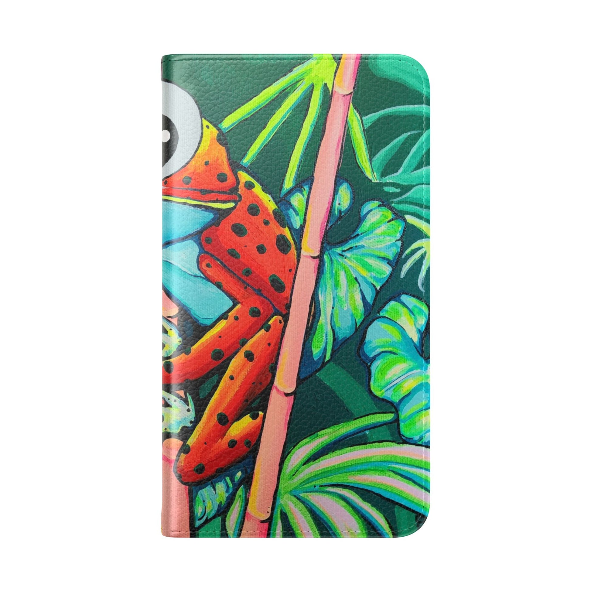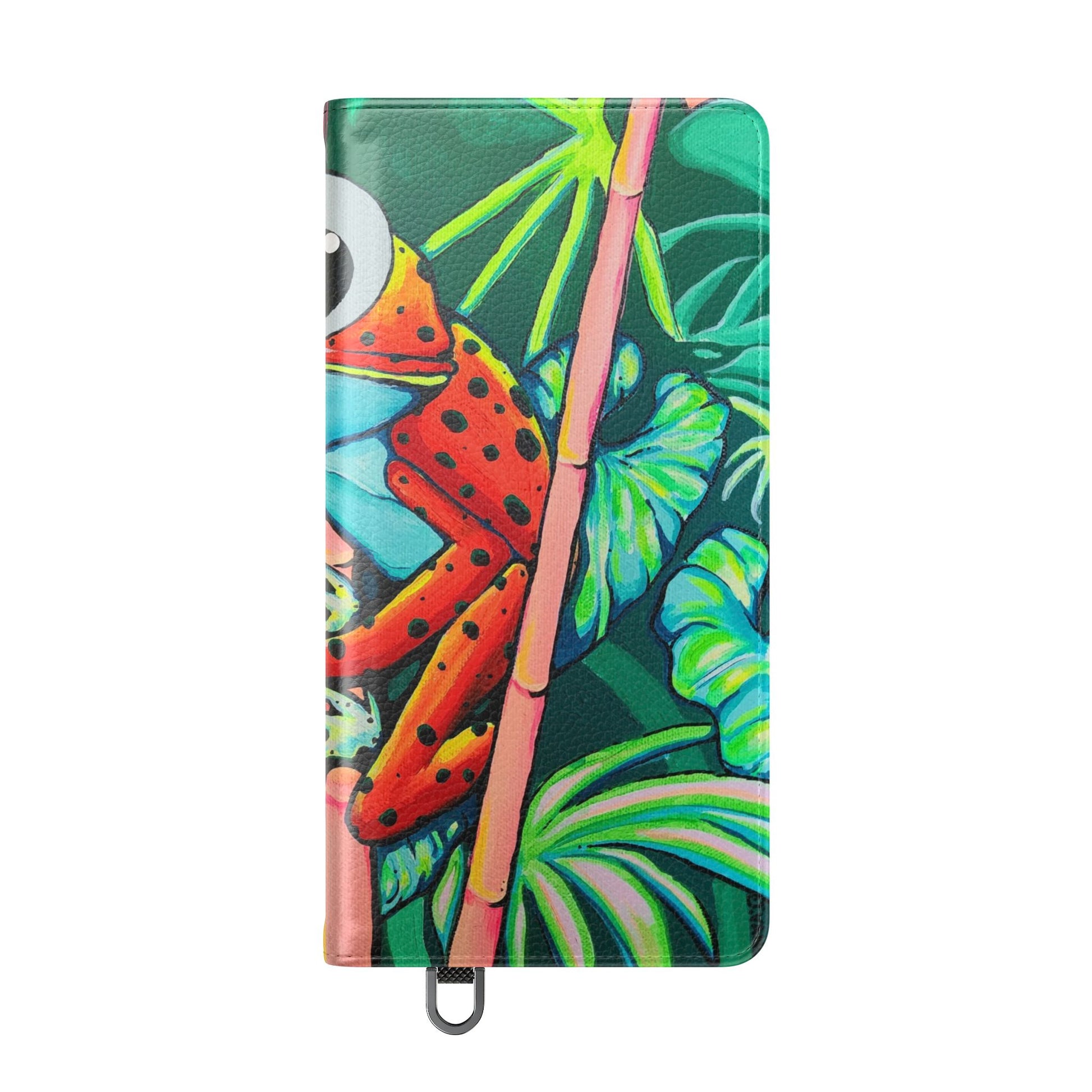 A lively flip phone case that brings color and curiosity to everyday carry. The lively tropical artwork — a wide-eyed red-and-blue tree frog nestled in lush green leaves — turns your phone into a tiny window to the rainforest. The folio-style design keeps essentials together: stitched card pockets for quick access, a durable polycarbonate inner shell for reliable protection, and a flat elastic closure to hold everything in place. Built from cruelty-free faux leather, it feels luxe without harming animals and includes a small care slip so the case stays looking fresh. For Samsung S24 and S25 users, a discreet D-ring allows attachment of a wrist or neck strap for hands-free moments on commutes or travels. The fold-out stand supports comfortable media viewing while ports remain open for easy charging and connectivity. Thoughtful, colorful, and practical — this case adds personality while keeping your phone and essentials secure.
