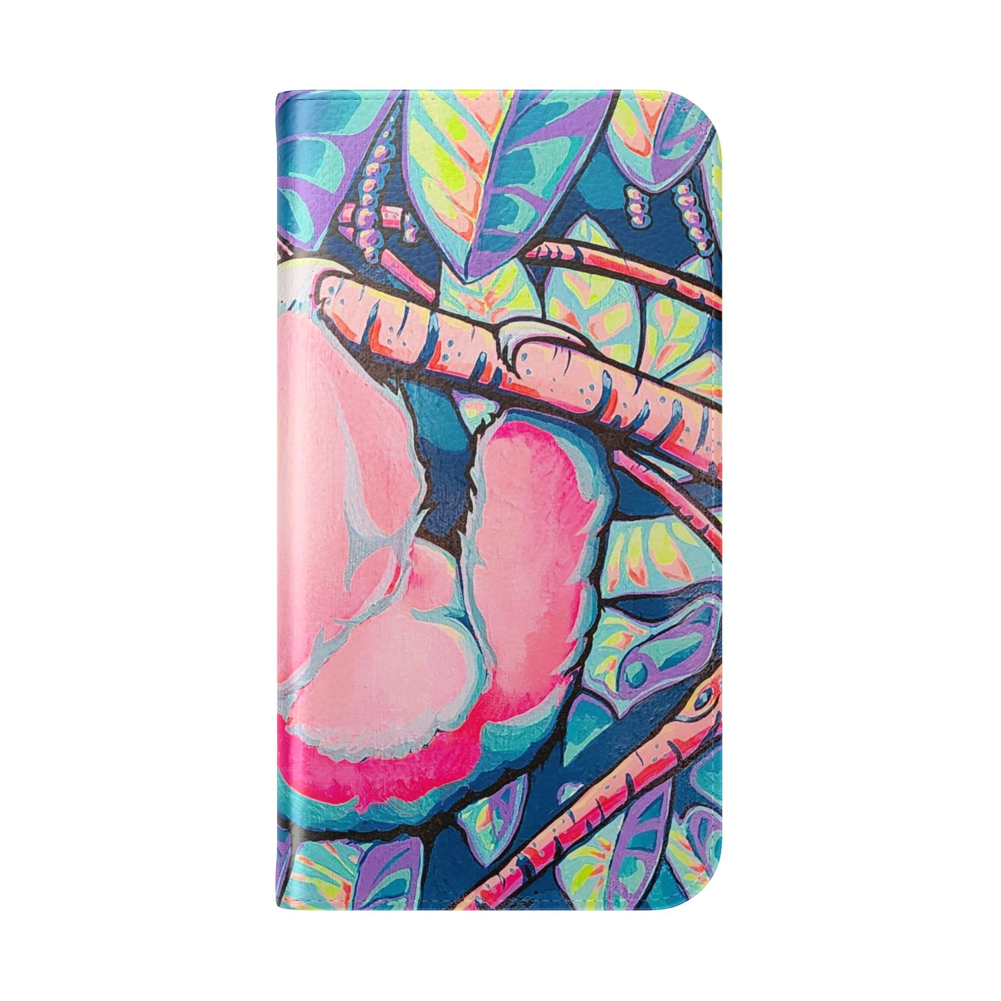 A lively flip phone case that brings color and curiosity to everyday carry. The lively tropical artwork — Cyclops Sloth — turns your phone into a tiny window to island living. The folio-style design keeps essentials together: stitched card pockets for quick access, a durable polycarbonate inner shell for reliable protection, and a flat elastic closure to hold everything in place. Built from cruelty-free faux leather, it feels luxe without harming animals and includes a small care slip so the case stays looking fresh. For Samsung S24 and S25 users, a discreet D-ring allows attachment of a wrist or neck strap for hands-free moments on commutes or travels. The fold-out stand supports comfortable media viewing while ports remain open for easy charging and connectivity. Thoughtful, colorful, and practical — this case adds personality while keeping your phone and essentials secure.