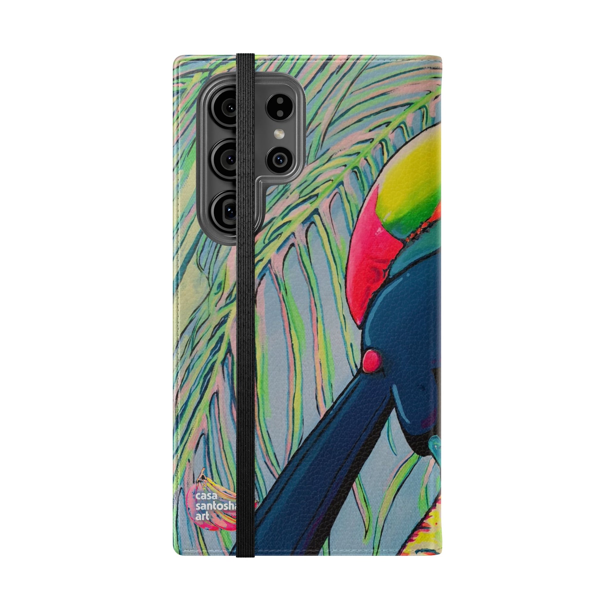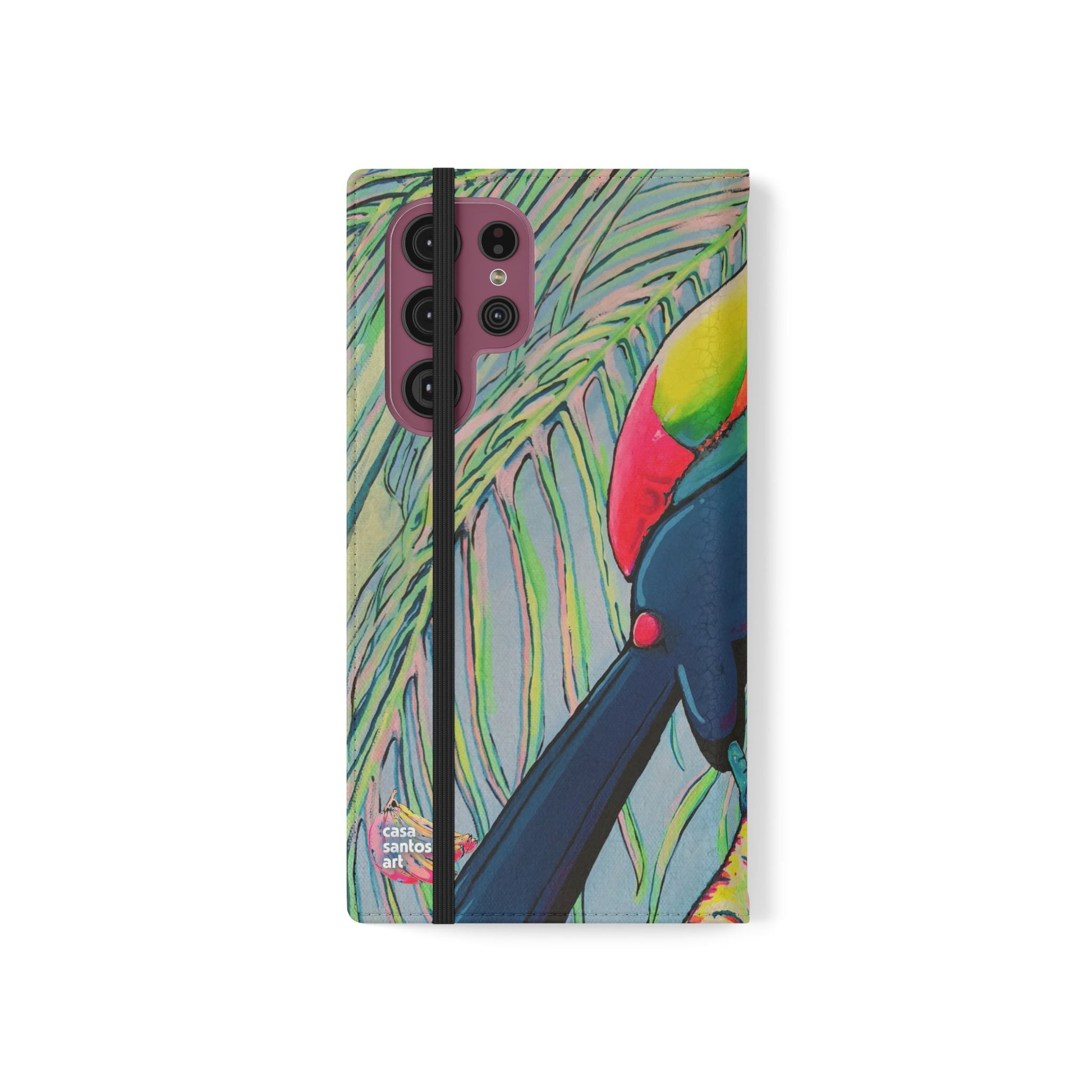 A lively flip phone case that brings color and curiosity to everyday carry. The lively tropical artwork — Cyclops Toucan — turns your phone into a tiny window to island living. The folio-style design keeps essentials together: stitched card pockets for quick access, a durable polycarbonate inner shell for reliable protection, and a flat elastic closure to hold everything in place. Built from cruelty-free faux leather, it feels luxe without harming animals and includes a small care slip so the case stays looking fresh. For Samsung S24 and S25 users, a discreet D-ring allows attachment of a wrist or neck strap for hands-free moments on commutes or travels. The fold-out stand supports comfortable media viewing while ports remain open for easy charging and connectivity. Thoughtful, colorful, and practical — this case adds personality while keeping your phone and essentials secure.