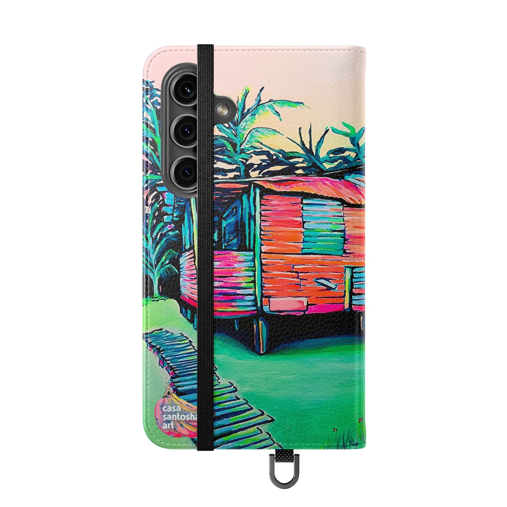 A lively flip phone case that brings color and curiosity to everyday carry. The lively tropical artwork — Luis Russell House Bocas — turns your phone into a tiny window to island living. The folio-style design keeps essentials together: stitched card pockets for quick access, a durable polycarbonate inner shell for reliable protection, and a flat elastic closure to hold everything in place. Built from cruelty-free faux leather, it feels luxe without harming animals and includes a small care slip so the case stays looking fresh. For Samsung S24 and S25 users, a discreet D-ring allows attachment of a wrist or neck strap for hands-free moments on commutes or travels. The fold-out stand supports comfortable media viewing while ports remain open for easy charging and connectivity. Thoughtful, colorful, and practical — this case adds personality while keeping your phone and essentials secure.