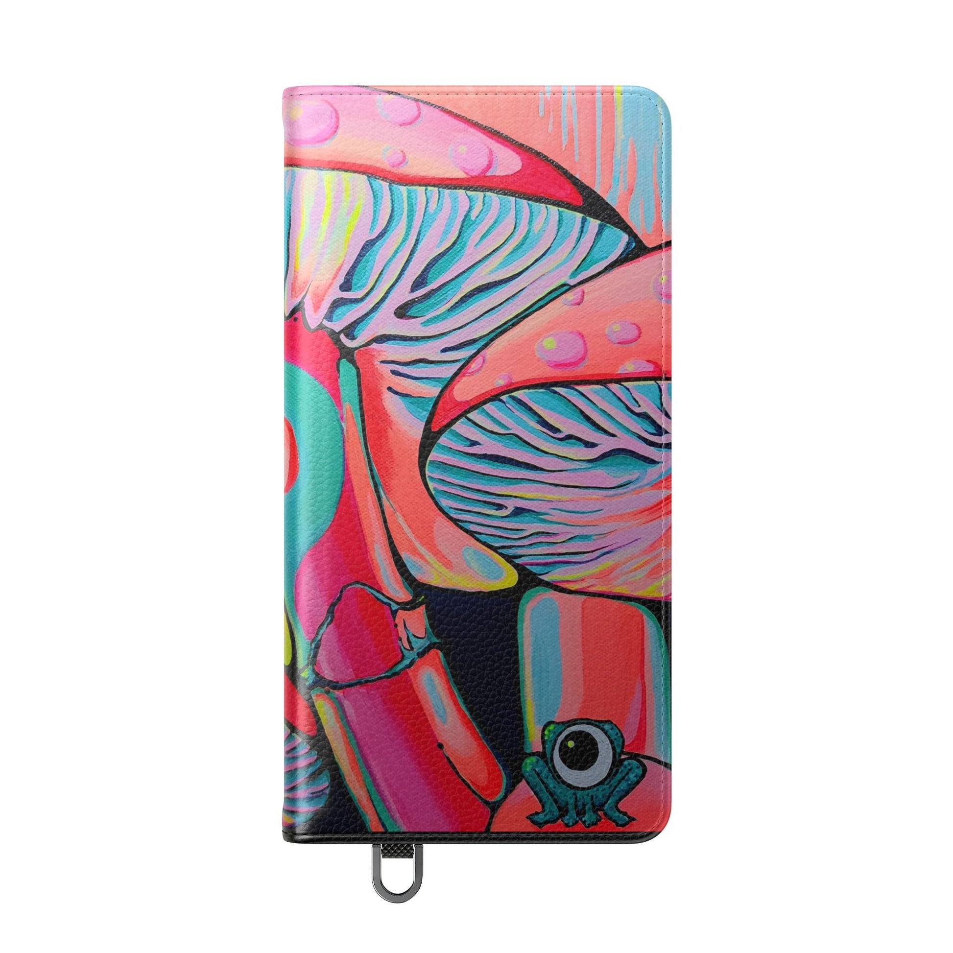 A lively flip phone case that brings color and curiosity to everyday carry. The lively tropical artwork — Trippy Mushrooms — turns your phone into a tiny window to neon living. The folio-style design keeps essentials together: stitched card pockets for quick access, a durable polycarbonate inner shell for reliable protection, and a flat elastic closure to hold everything in place. Built from cruelty-free faux leather, it feels luxe without harming animals and includes a small care slip so the case stays looking fresh. For Samsung S24 and S25 users, a discreet D-ring allows attachment of a wrist or neck strap for hands-free moments on commutes or travels. The fold-out stand supports comfortable media viewing while ports remain open for easy charging and connectivity. Thoughtful, colorful, and practical — this case adds personality while keeping your phone and essentials secure.