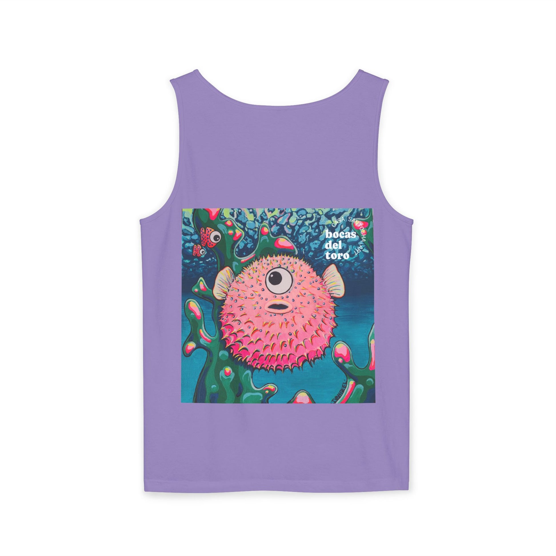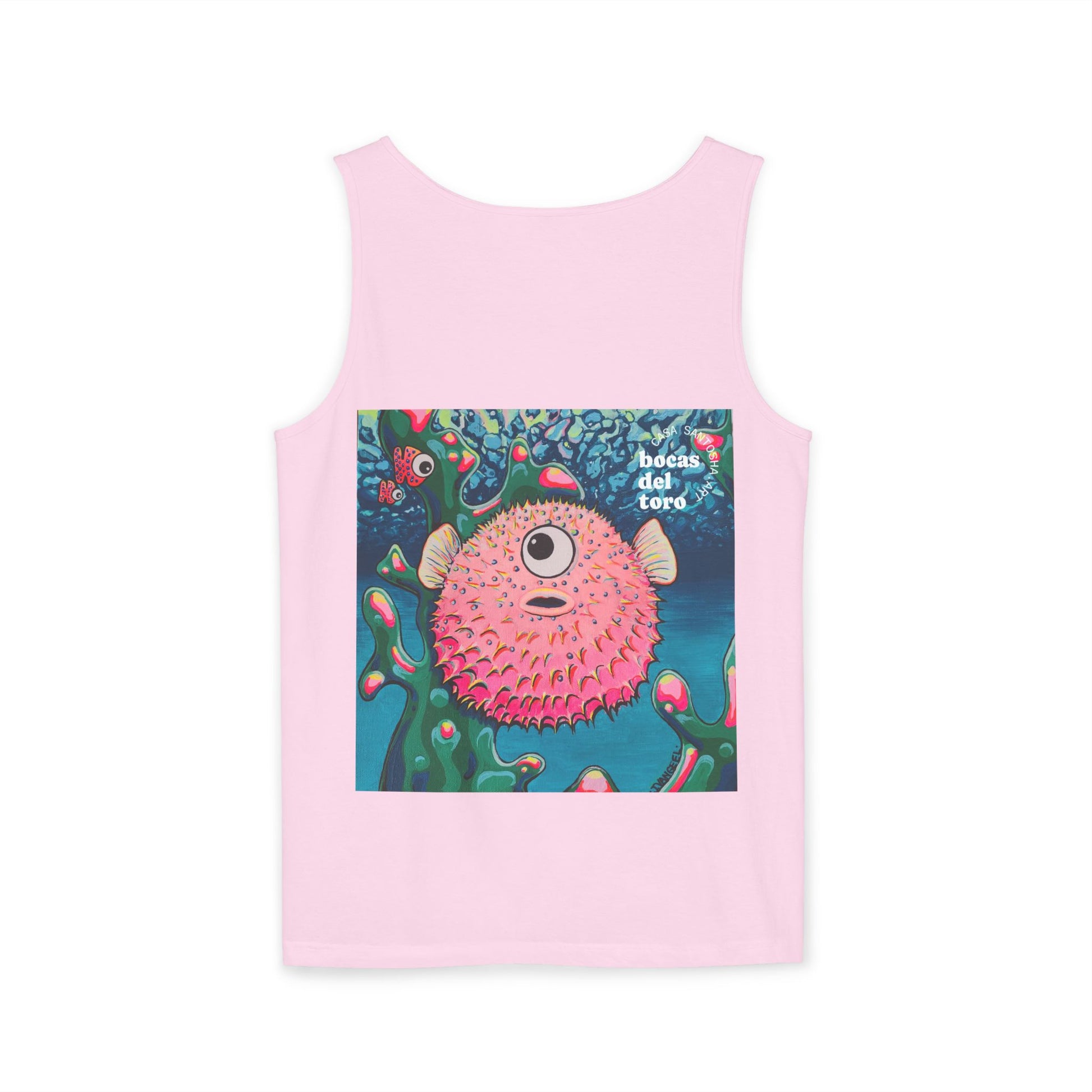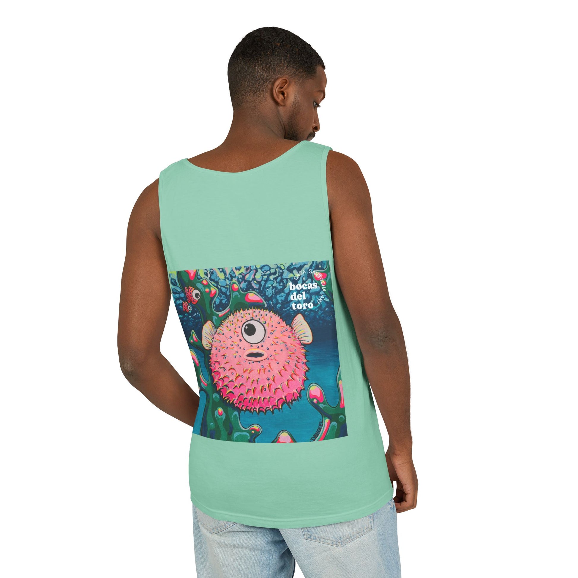 Unisex Cyclops Pufferfish Tank Top - Perfect for Summer Vibes. This tank top exudes a fun and vibrant summer feel, perfect for casual outings or beach days. Ideal for those who enjoy bright, bold colors and want to stand out in the crowd. Perfect for summer parties, music festivals, and beach vacations.