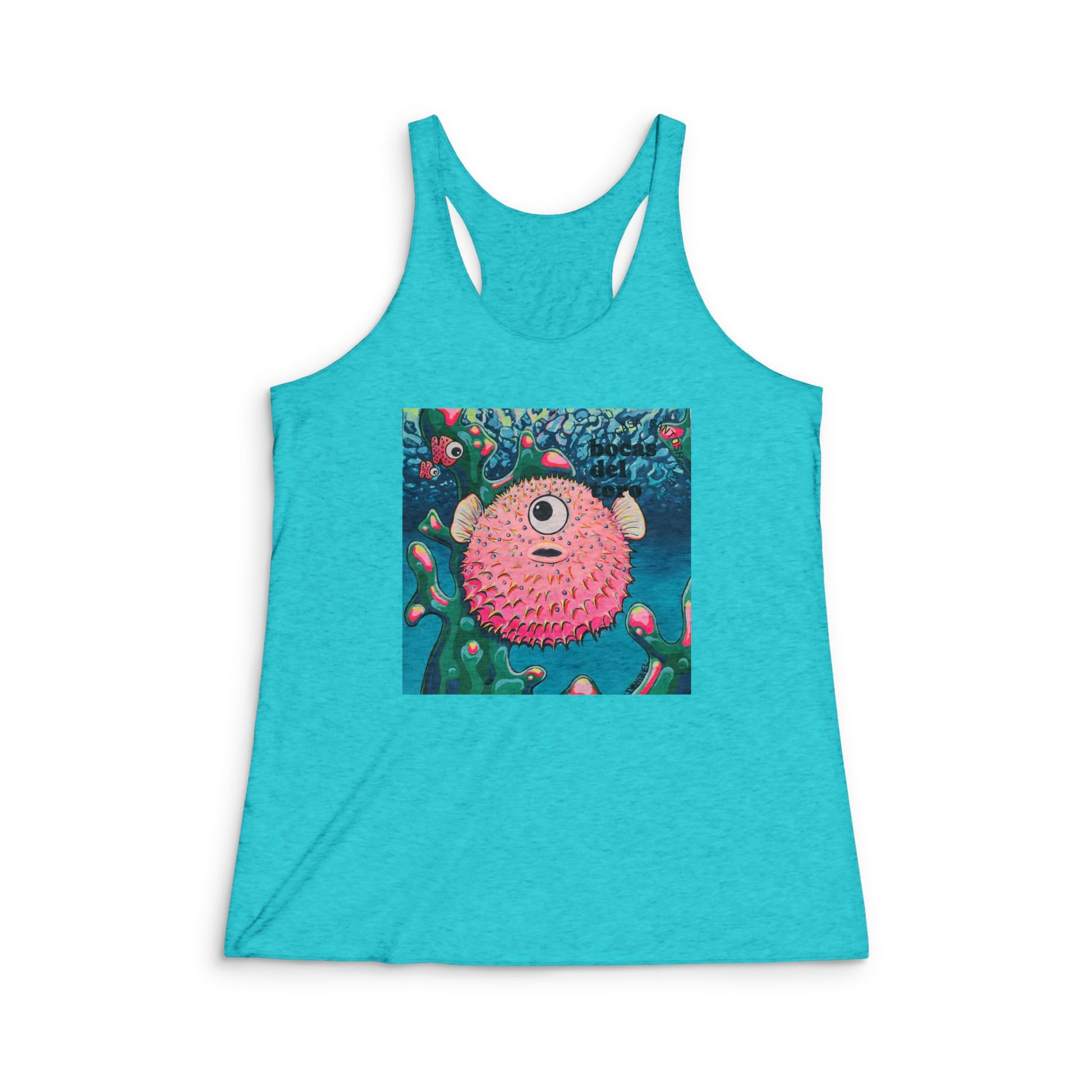 This Women's Cyclops Pufferfish Graphic Tank is perfect for those who love bright and fun designs. The soft tri-blend fabric makes it comfortable to wear all day long. This tank is great for casual wear, workouts, or fun summer outings. It is relevant for summer, beach vacations, tropical themes, and casual hangouts with friends.